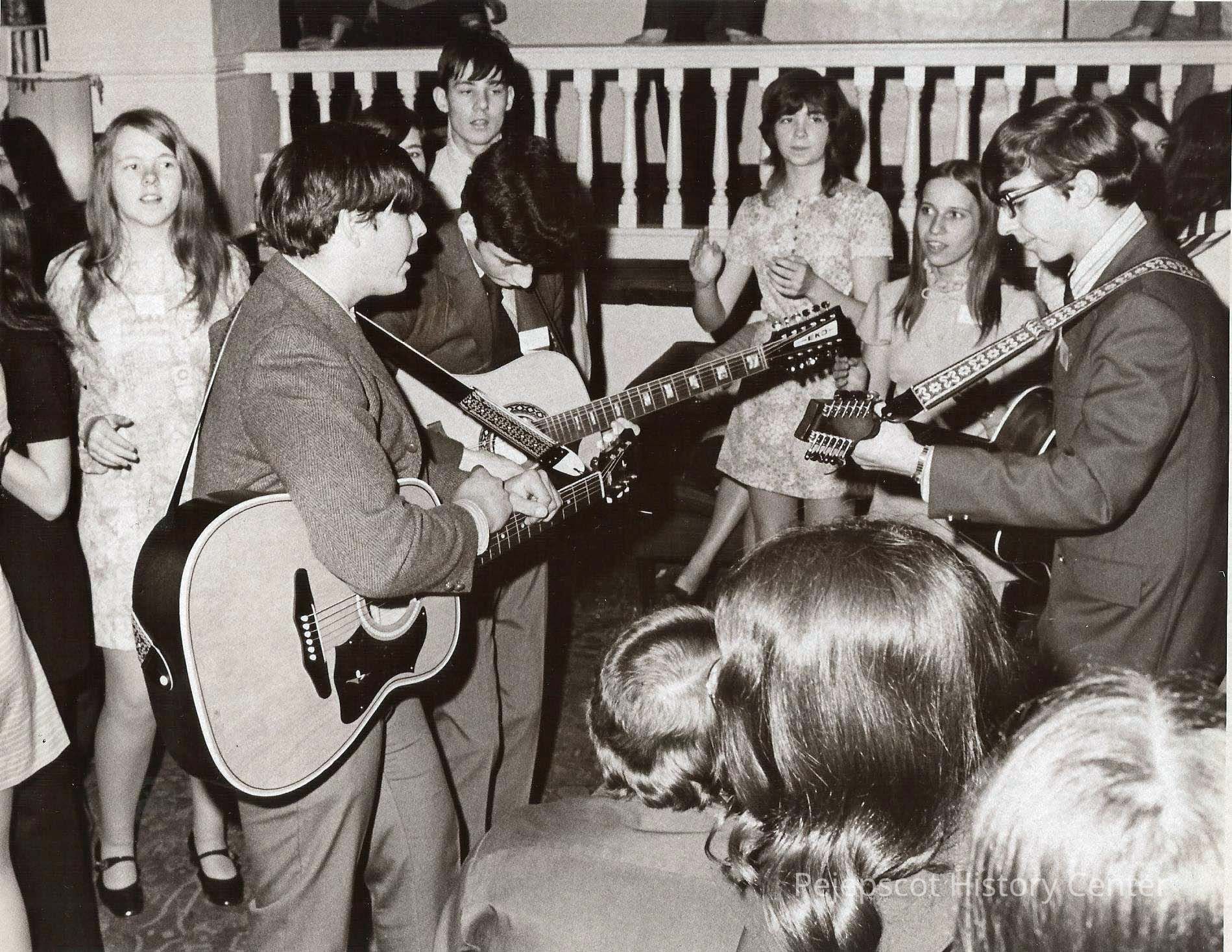 A B/W photograph of a group of young people partying. Three of them have guitar.