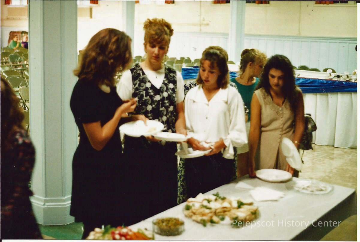 A color photograph of people in a food line. As always the one in front always wants to stop and talk.
