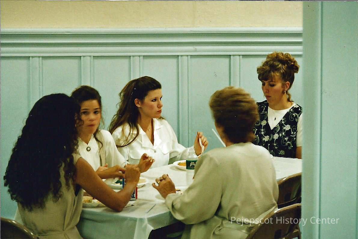 A color photograph of girls sitting at a table eating. Photographer's # 2-14 CYO sponsored