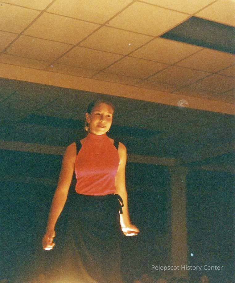 A color photograph of a girl on stage. Photographer's # 3-2 CYO sponsored
