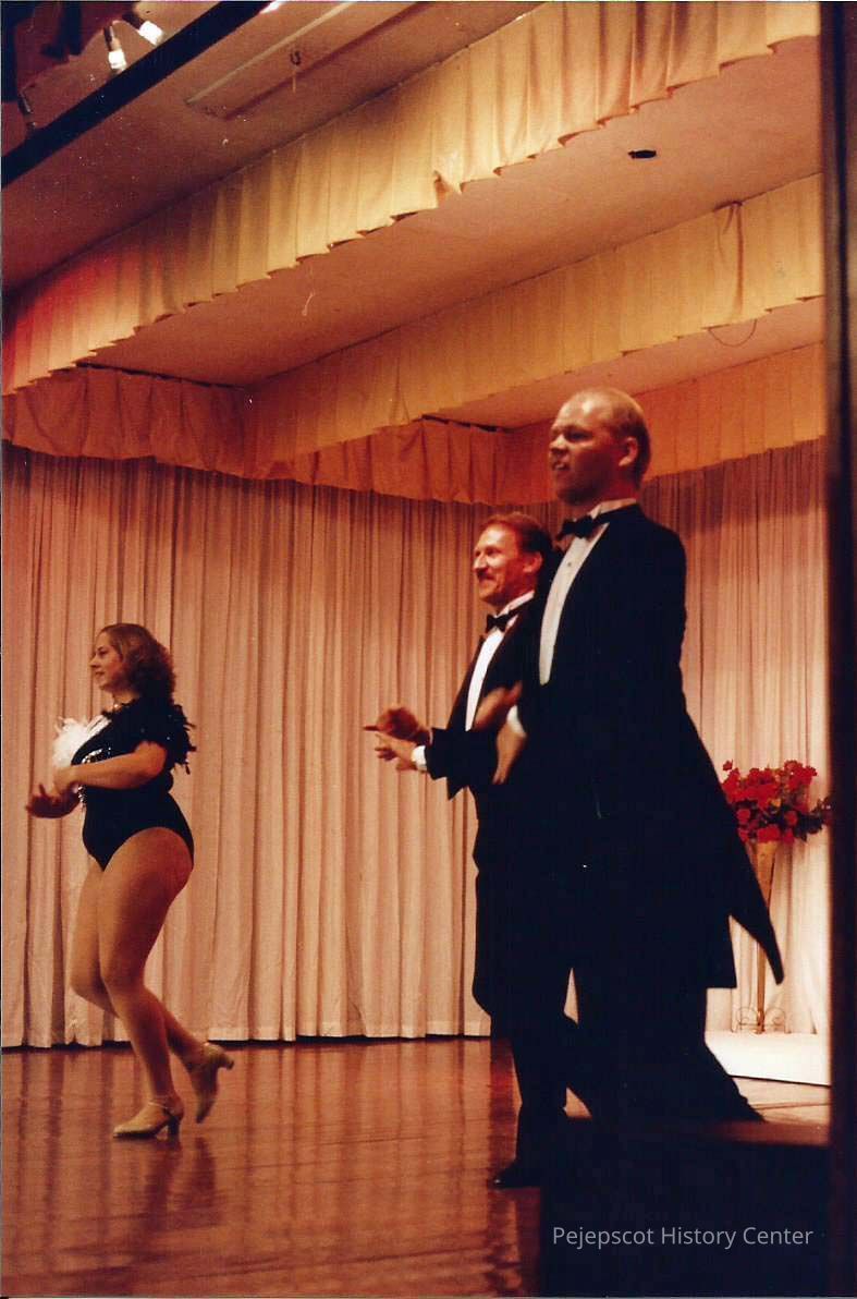 A color photograph of 3 people dancing. Photographer's # 4-27 CYO sponsored