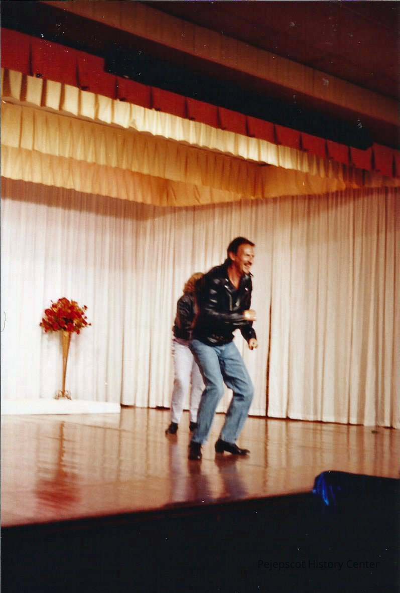 A color photograph of 2 people dancing on stage. Photographer's # 4-32 CYO sponsored