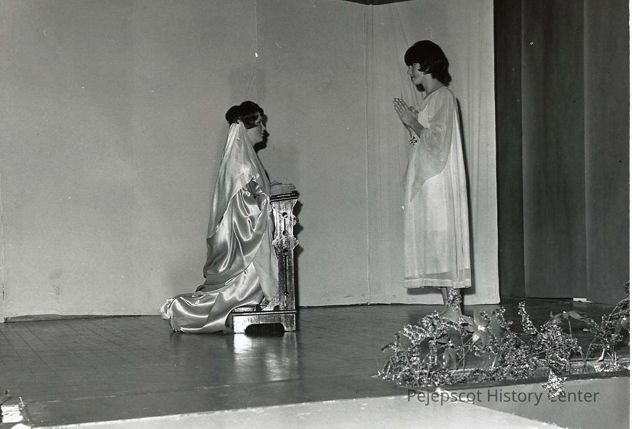 A B/W photograph of two girls on stage. The caption provided, "The angel appears to Blessed Virgin to tell her she is going to be the mother of God."