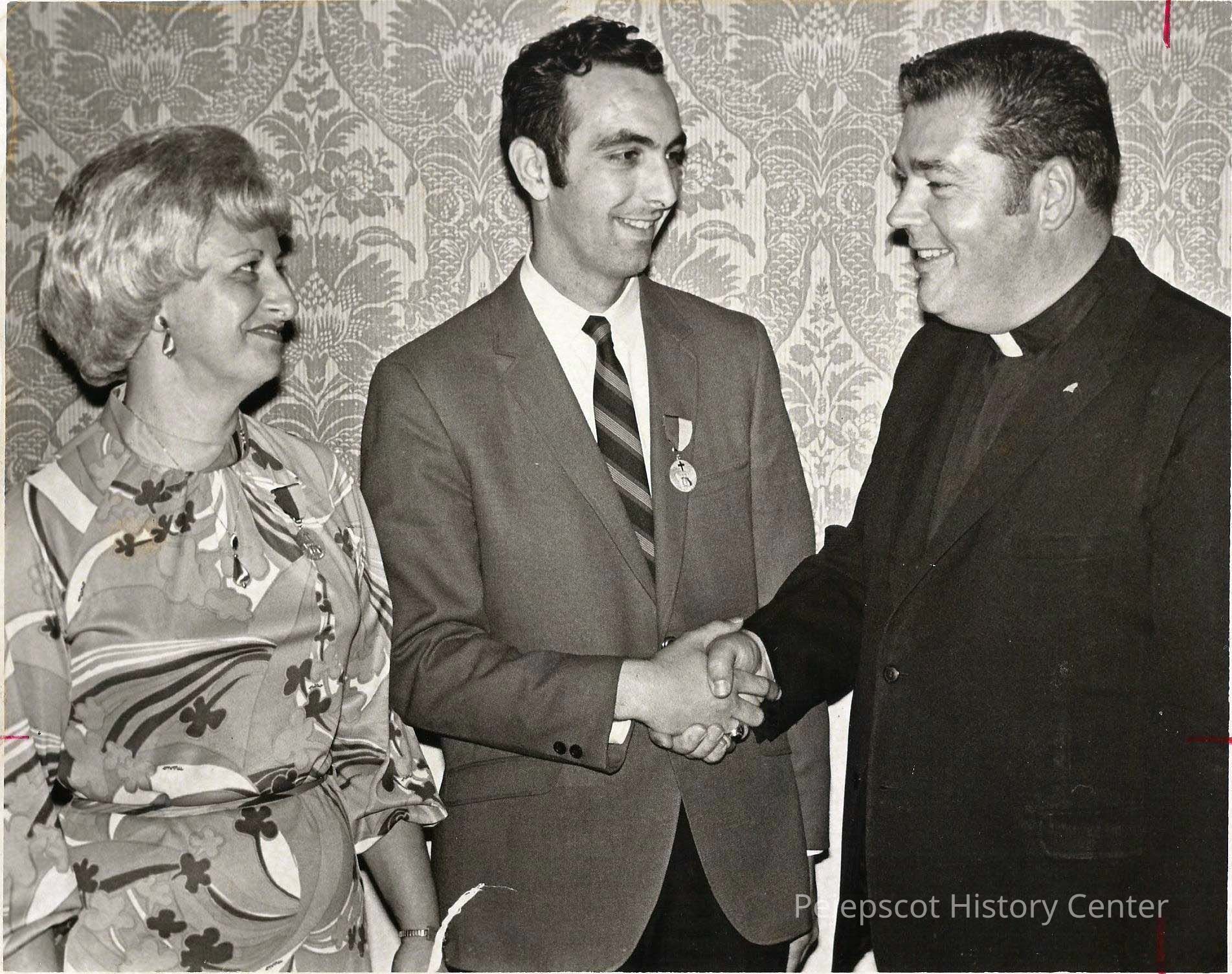 A color photograph of a Brunswick couple shaking hands with an Auburn priest. Photographer's # CYO sponsored