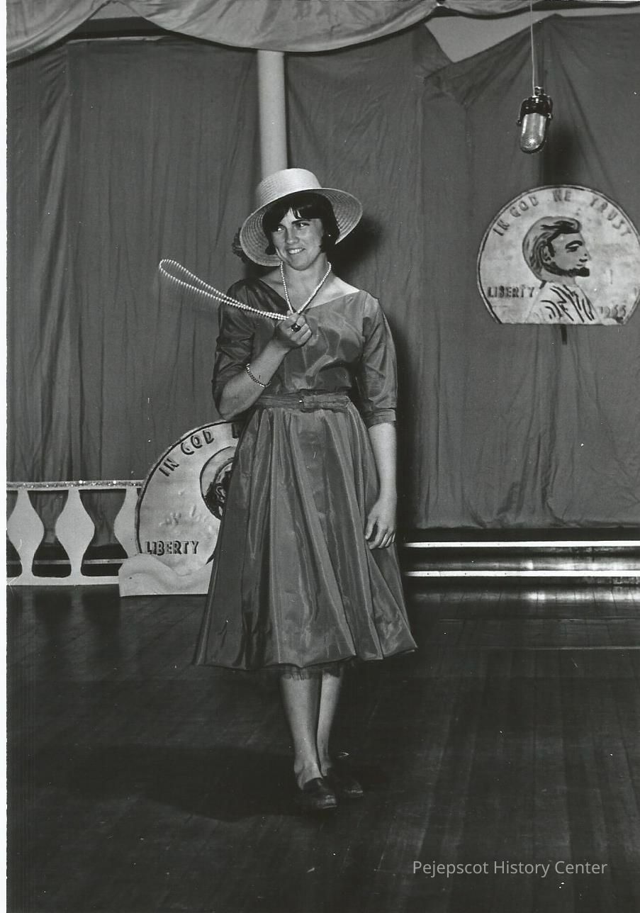 A B/W photograph of an unknown woman who has a hat on and is twirling her neckless.
