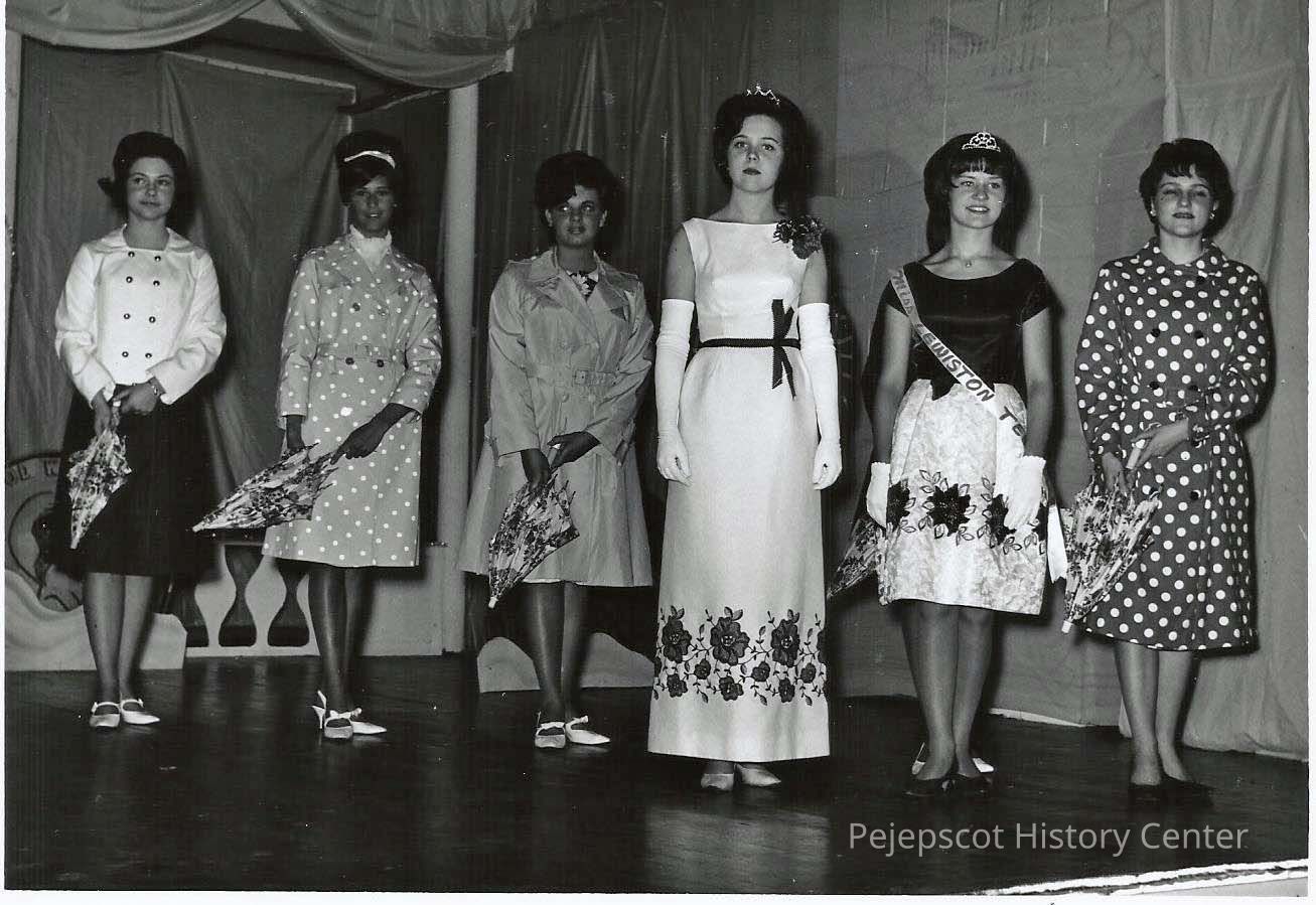A B/W photograph of unknown women in street clothes carrying umbrellas..