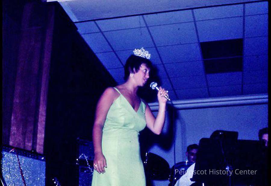 A 35 mm slide of a contestant in the 1975 Miss Teen Queen Pageant. It is marked "Jul 75" and "9". Sponsored by Christian Youth Organization (CYO).