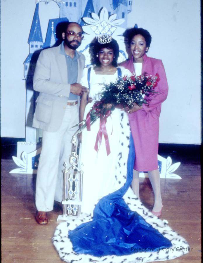 A 35 mm color slide of a winner and her parents in the 1983 Miss Teen Queen Pageant. The slide is marked, "Jul 83" and "19".