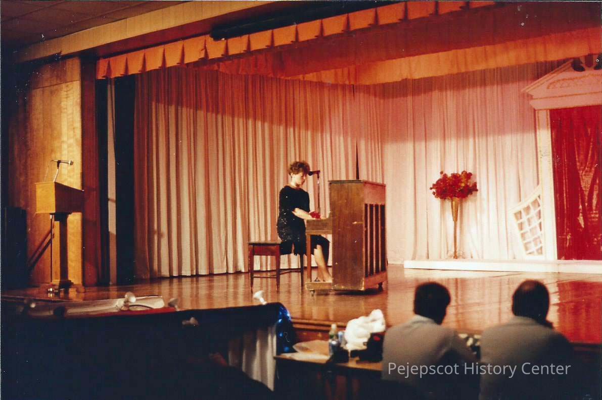 A color photograph of a woman playing a piano. Photographer's # 4-30 CYO sponsored