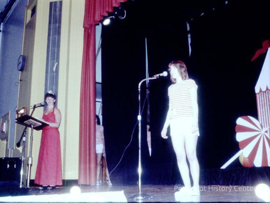 A 35 mm color slide of a contestant in the 1980 Miss Teen Queen Pageant. The slide is marked, "Jul 80" and by a printed "6". Sponsored by Christian Youth Organization (CYO).
