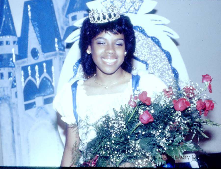 A 35 mm color slide of a contestant in the 1983 Miss Teen Queen Pageant. The slide is marked, "Jul 83" and "34".