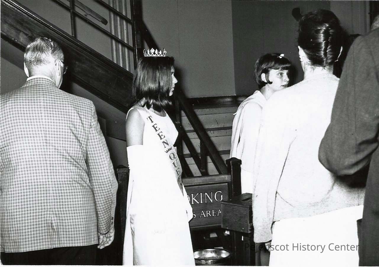 A B/W photograph of several people standing around. One girl is wearing a "Teen Queen" banner.