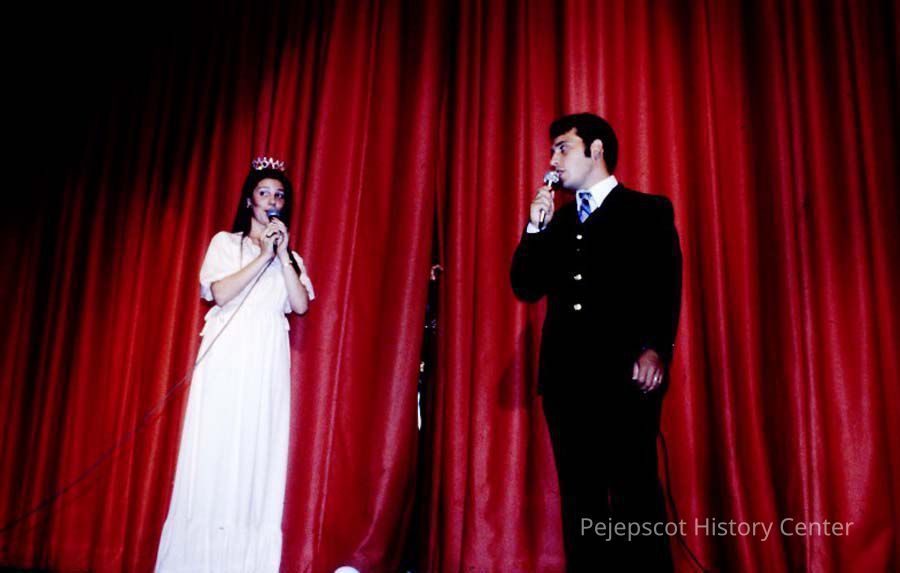 A 35 mm color slide of the winner and MC in the 1980 Miss Teen Queen Pageant. The slide is marked, "Jul 80" and by a printed "10". Sponsored by Christian Youth Organization (CYO).