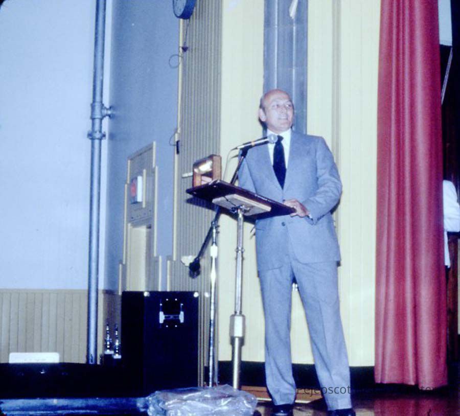 A 35 mm color slide of the "MC" in the 1980 Miss Teen Queen Pageant. The slide is marked, "Jul 80" and by a printed "5". Sponsored by Christian Youth Organization (CYO).