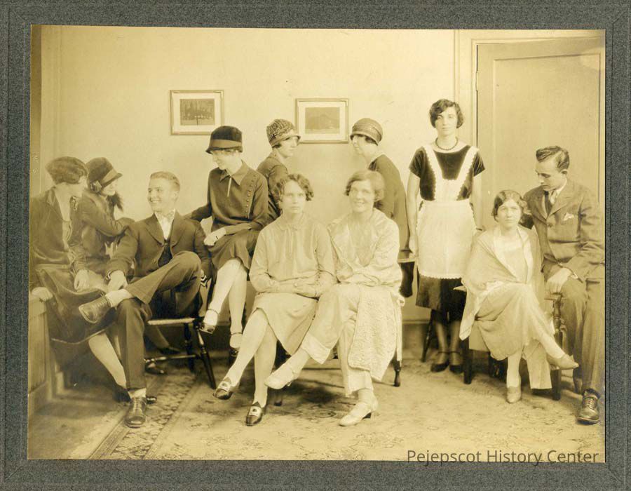 Sepia-toned photograph of 11 unidentified individuals (2 men, nine women) appearing to be cast of a play. Saturday Club
