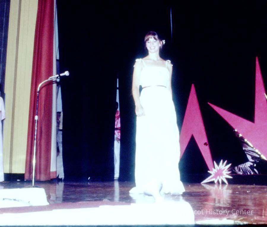 A 35 mm color slide of a contestant in the 1984 Miss Teen Queen Pageant. The slide is marked, "Jul 84" and "25".