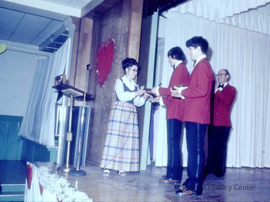 A 35 mm slide of 3 men and a women in the 1974 Miss Teen Queen Pageant. It is marked "Jul 74", "2-23" and "11". Sponsored by Christian Youth Organization (CYO).