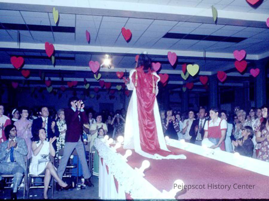 A 35 mm slide of people applauding the new Queen in the 1974 Miss Teen Queen Pageant. It is marked "Jul 74" and "19". Sponsored by Christian Youth Organization (CYO).