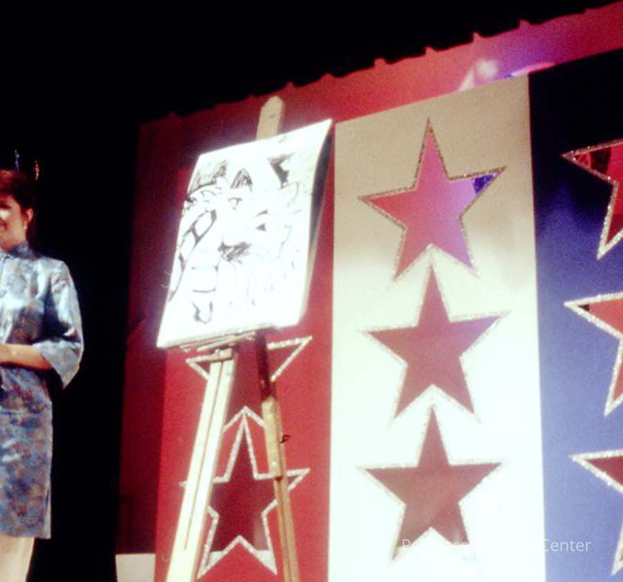 A 35 mm color slide of a contestant in the 1986 Miss Teen Queen Pageant. The slide is marked, "Jun 86" and "9".