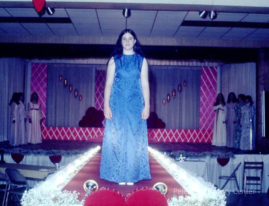 A 35 mm slide of a contestant in the 1974 Miss Teen Queen Pageant. It is marked "Jul 74" and "4". Sponsored by Christian Youth Organization (CYO).