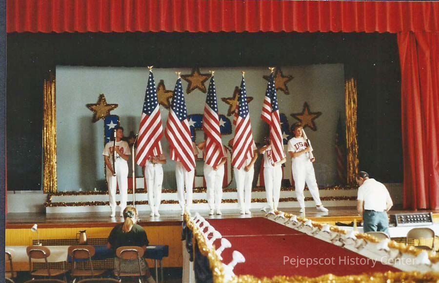 Dress Rehearsal. A color photograph of contestants entering for opening number with guns, Miss Brunswick, flags and Teen Queen contestants.
