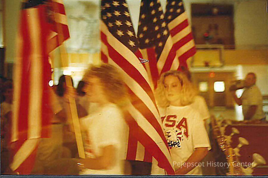 A color photograph of Robin Moody and Darby Labbe walking towards the stage. Photographers number 2-1 CYO sponsored