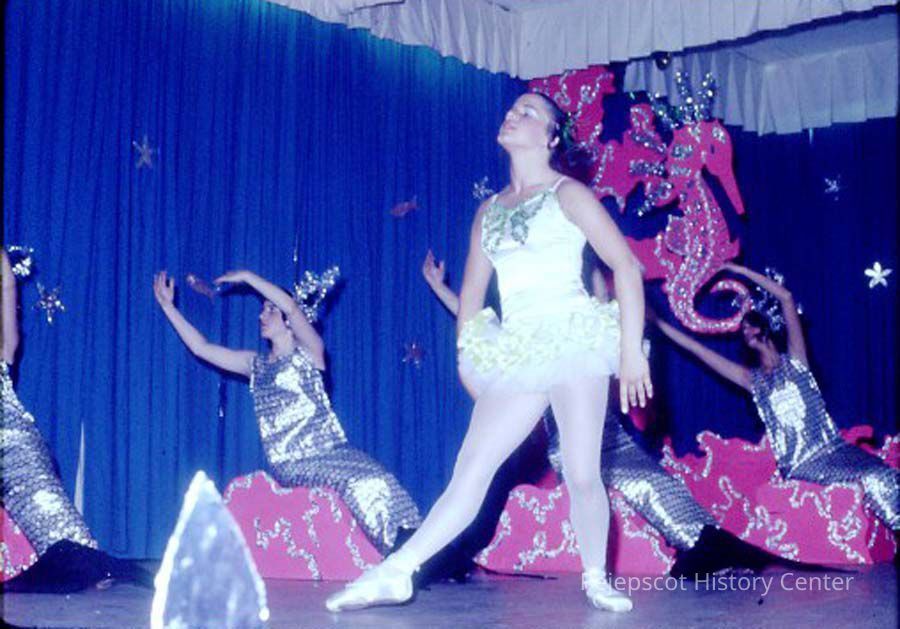 A 35 mm slide of contestants dancing in the 1975 Miss Teen Queen Pageant. It is marked "Jul 75", "1-5" and "16". Sponsored by Christian Youth Organization (CYO).