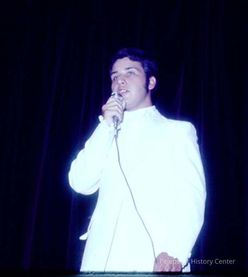 A 35 mm slide of a singer (Maybe?) in the 1975 Miss Teen Queen Pageant. It is marked "Jul 75" "10". Sponsored by Christian Youth Organization (CYO).