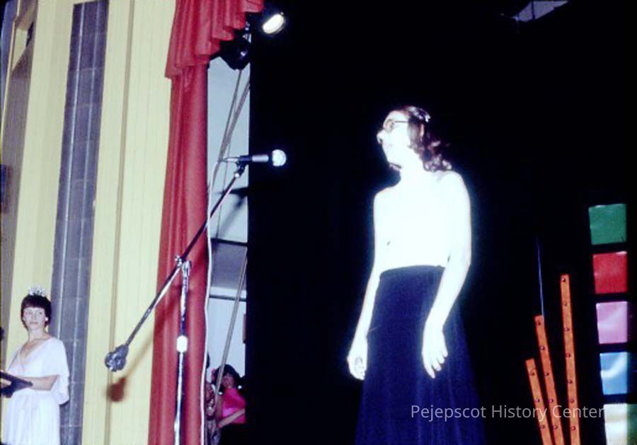 A 35 mm slide of a contestant in the 1979 Miss Teen Queen Pageant. It is marked "Jul 79" and "8". Sponsored by Christian Youth Organization (CYO).