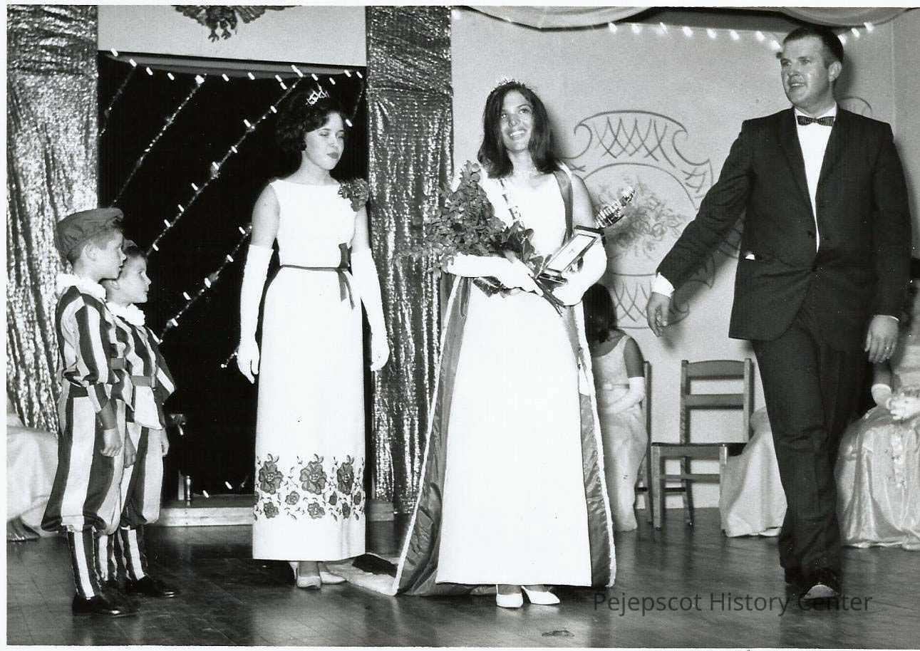A B/W photograph of 5 unknown people. One is wearing a "Teen Queen" banner.