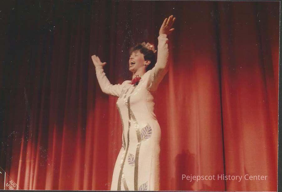 A color photograph of Sharon singing.