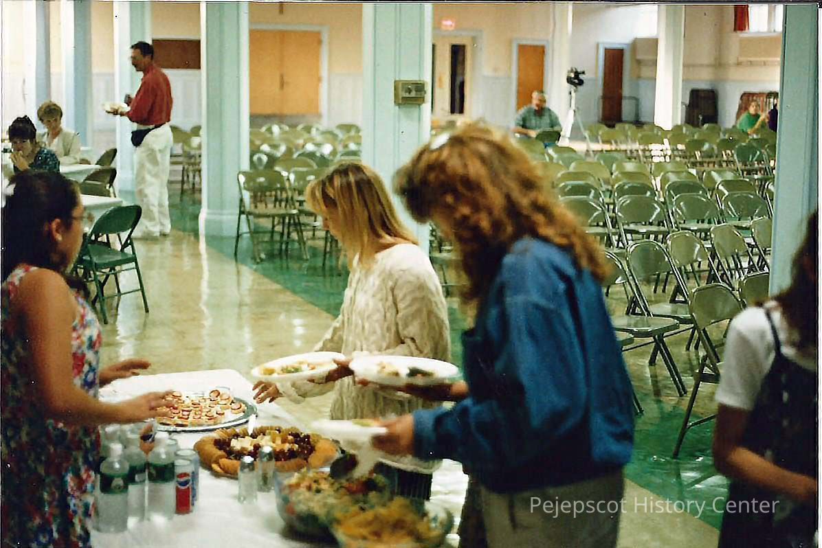 A color photograph of people getting food at the buffet line. Photographer's # 2-8 CYO sponsored