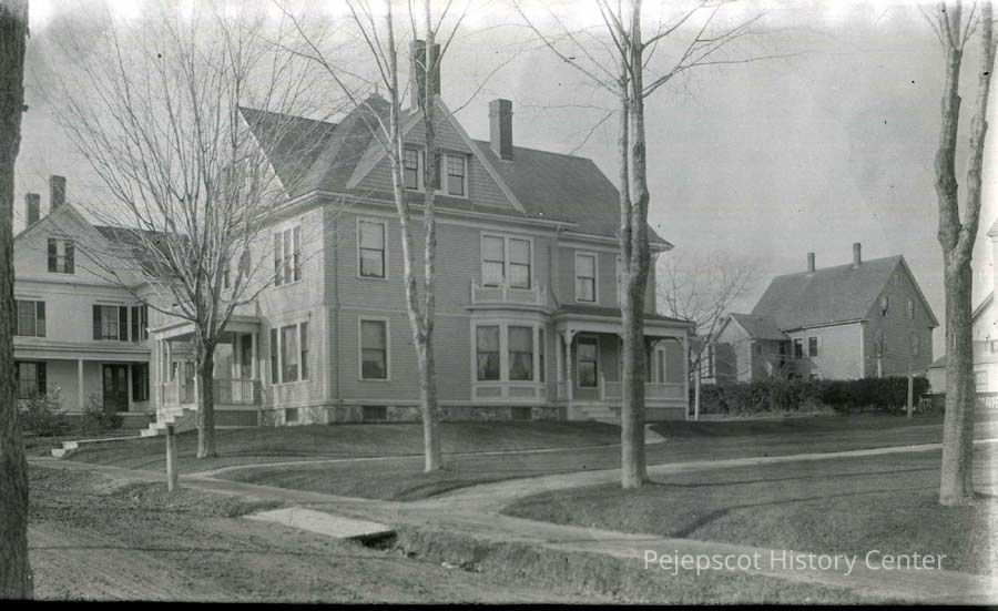A B/W photograph view of houses in Brunswick, ME. One is speculated to be a parsonage, but the houses are unidentified. Undated.