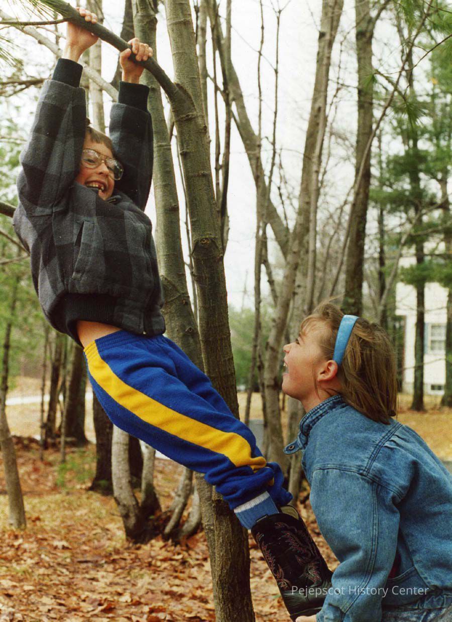 A color photo of two children playing in Topsham, Maine, is dated March 1988.