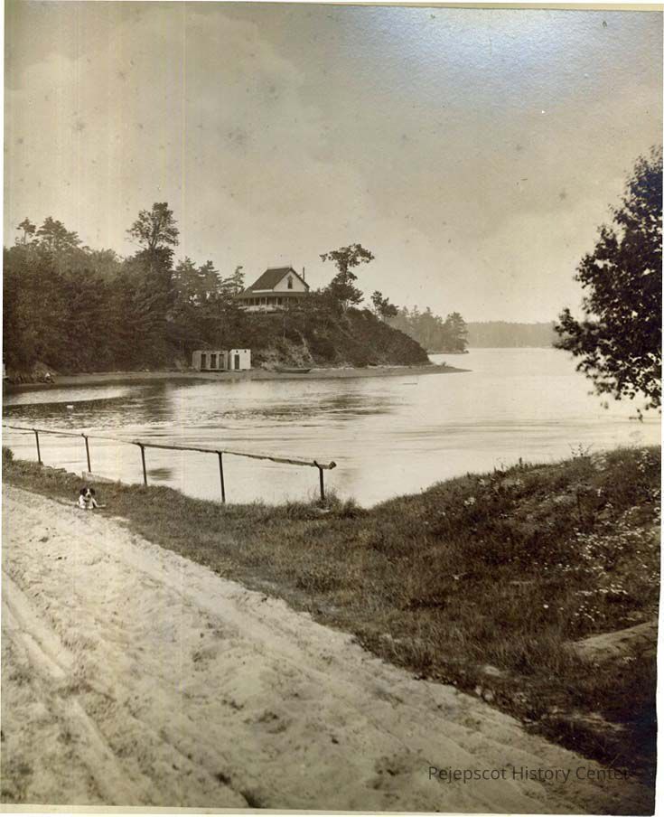 A black and white photograph of an unknown coastal house. A dog is present on the pathway. Undated.