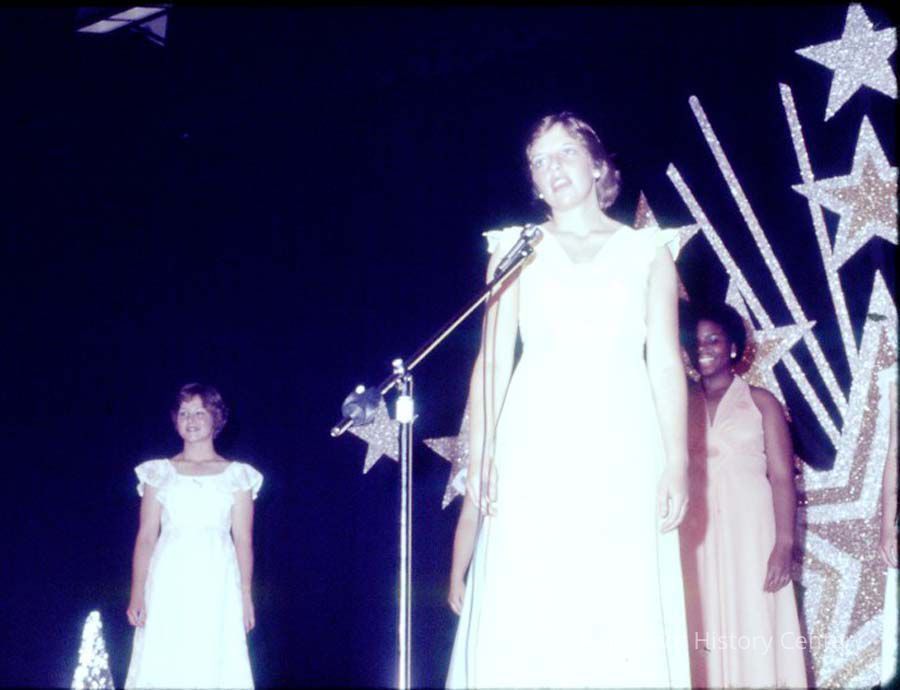 A 35 mm color slide of a few contestants in the 1977 Miss Teen Queen Pageant. The slide is marked, "Jul 77" and "18."
