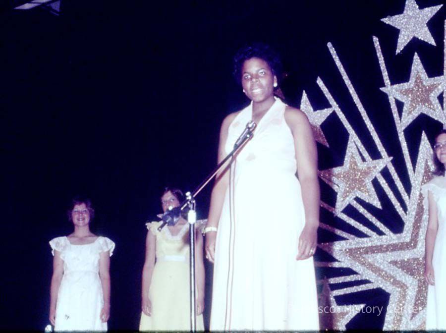 A 35 mm color slide of a few contestants in the 1977 Miss Teen Queen Pageant. The slide is marked, "Jul 77" and "1."