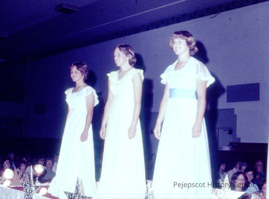 A 35 mm color slide of three contestants in the 1977 Miss Teen Queen Pageant. The slide is marked, "Jul 77" and "7."