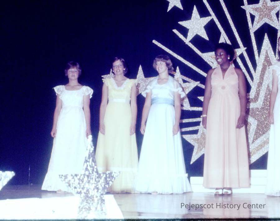A 35 mm color slide of four contestants in the1977 Miss Teen Queen Pageant. The slide is marked, "Jul 77" and "15."