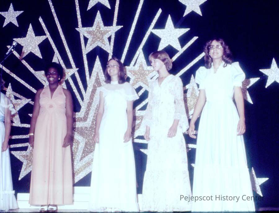 A 35 mm color slide of four contestants in the Miss Teen Queen Pageant. The slide is marked, "Jul 77" and "16."