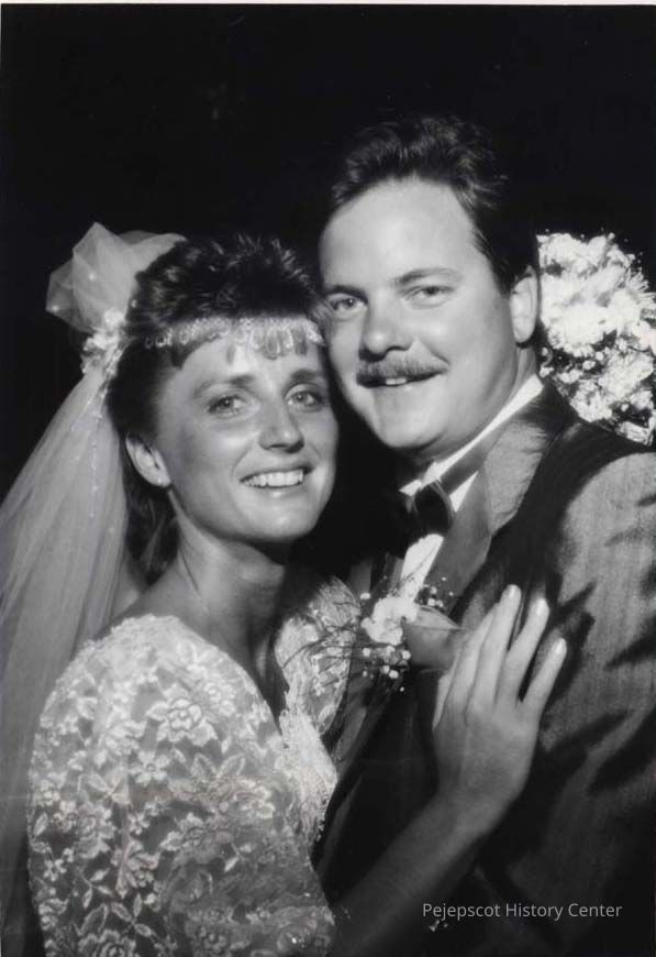 A black and white wedding photo of an unknown couple was published in The Times Record in Brunswick, Maine, on 9/14/1988. Two names are written on the photo. One is "Hill" and the other unreadable.