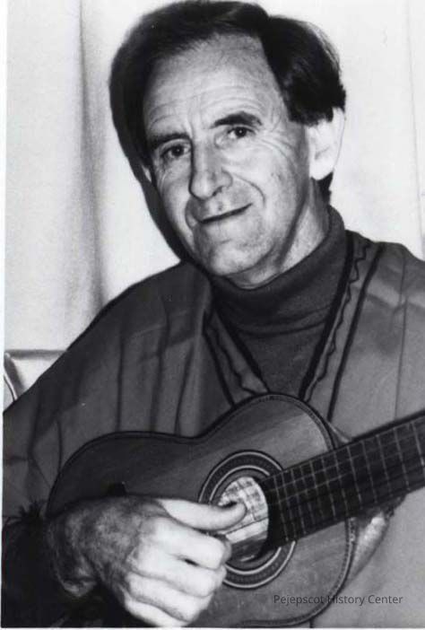 An undated black and white photo of [unknown] Edwards playing a guitar.