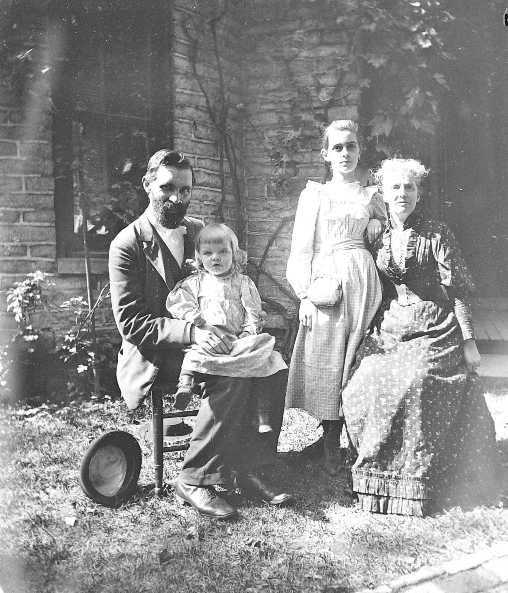 A glass plate negative with a portrait photograph of an unknown family sat outside. "CD-R "Glass Negative #2" #62 Undated.
