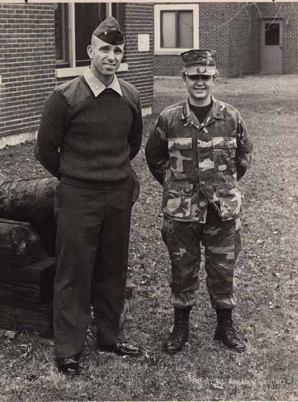 A black and white photograph of Lt. Col. [unknown] Gilman and his daughter, Lance Cpl. Gilman (was published in The Times Record in Brunswick, Maine, on 11/26/1990 &11/27/1990.