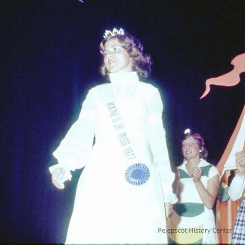 A 35 mm color slide of a girl with a crown on and a sash that reads "Maine's Jr Miss 1977." The slide is marked, "19" and "Jul 77".