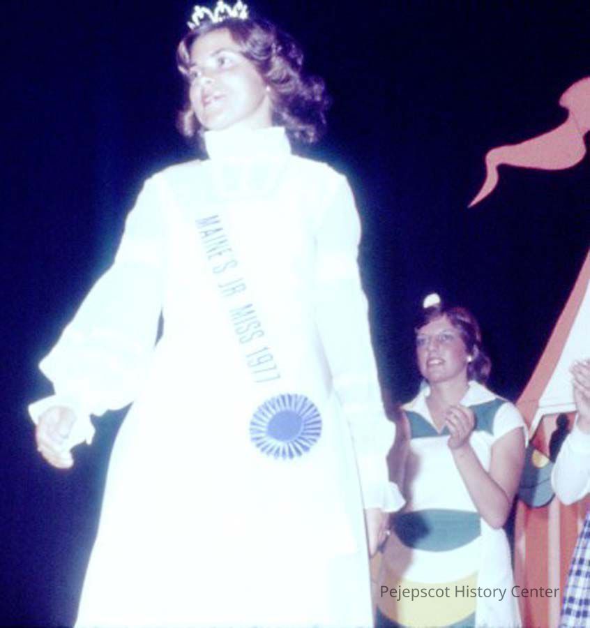 A 35 mm color slide of a girl with a crown on and a sash that reads "Maine's Jr Miss 1977." Appears to be a dupe of 2018.73.18