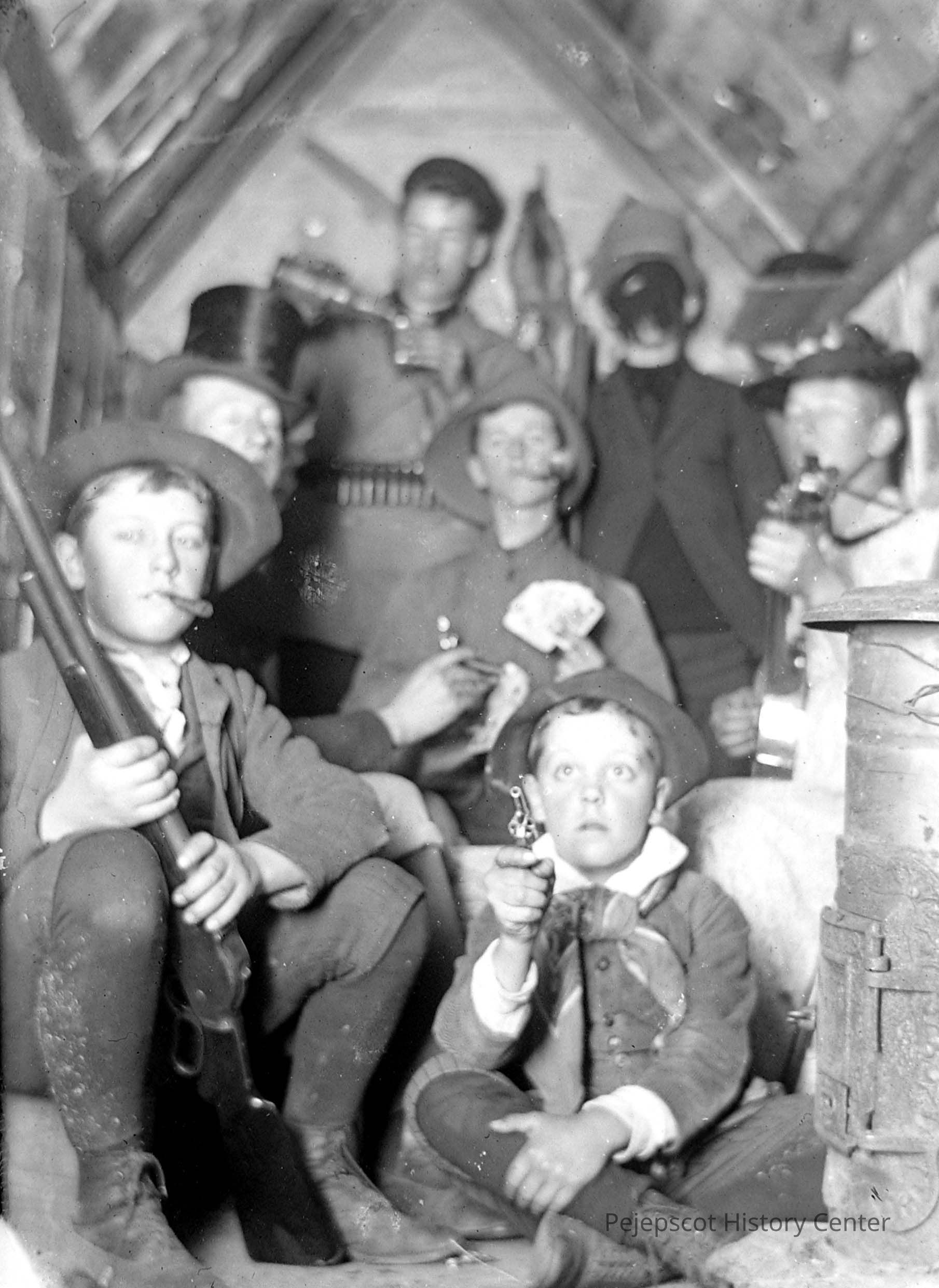 A glass plate negative with a photograph of an unknown group of young boys smoking and holding guns.