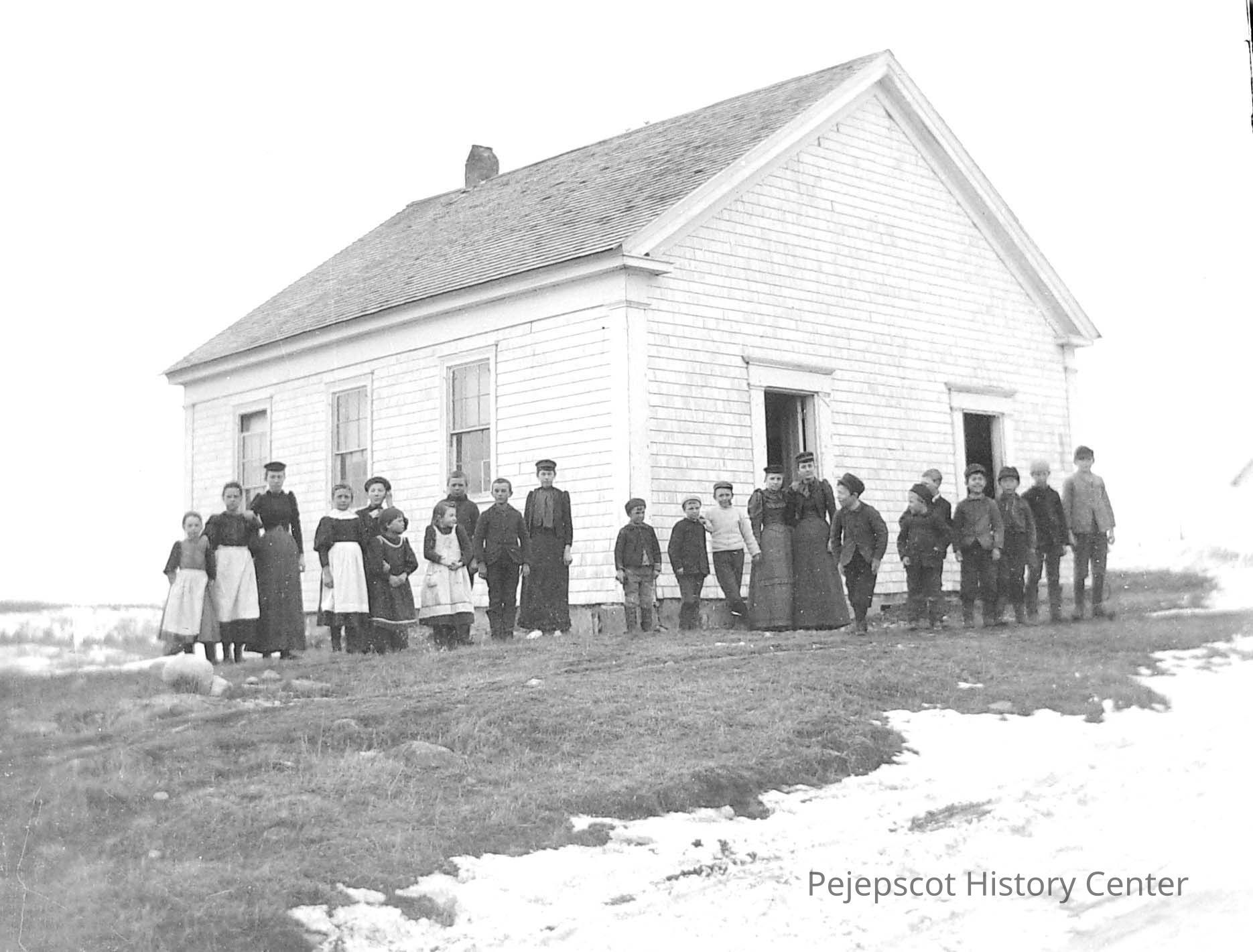 A glass negative with a photograph of a building with an unknown group of children. Possibly a one room school house.