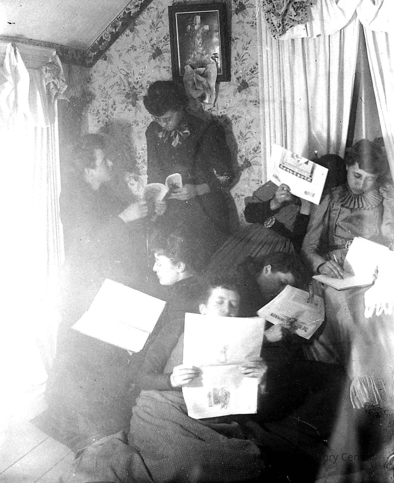 A glass plate negative No.17 with a photograph on a CD-R of a group of people reading the newspaper in a sitting room. Undated.Lexicon