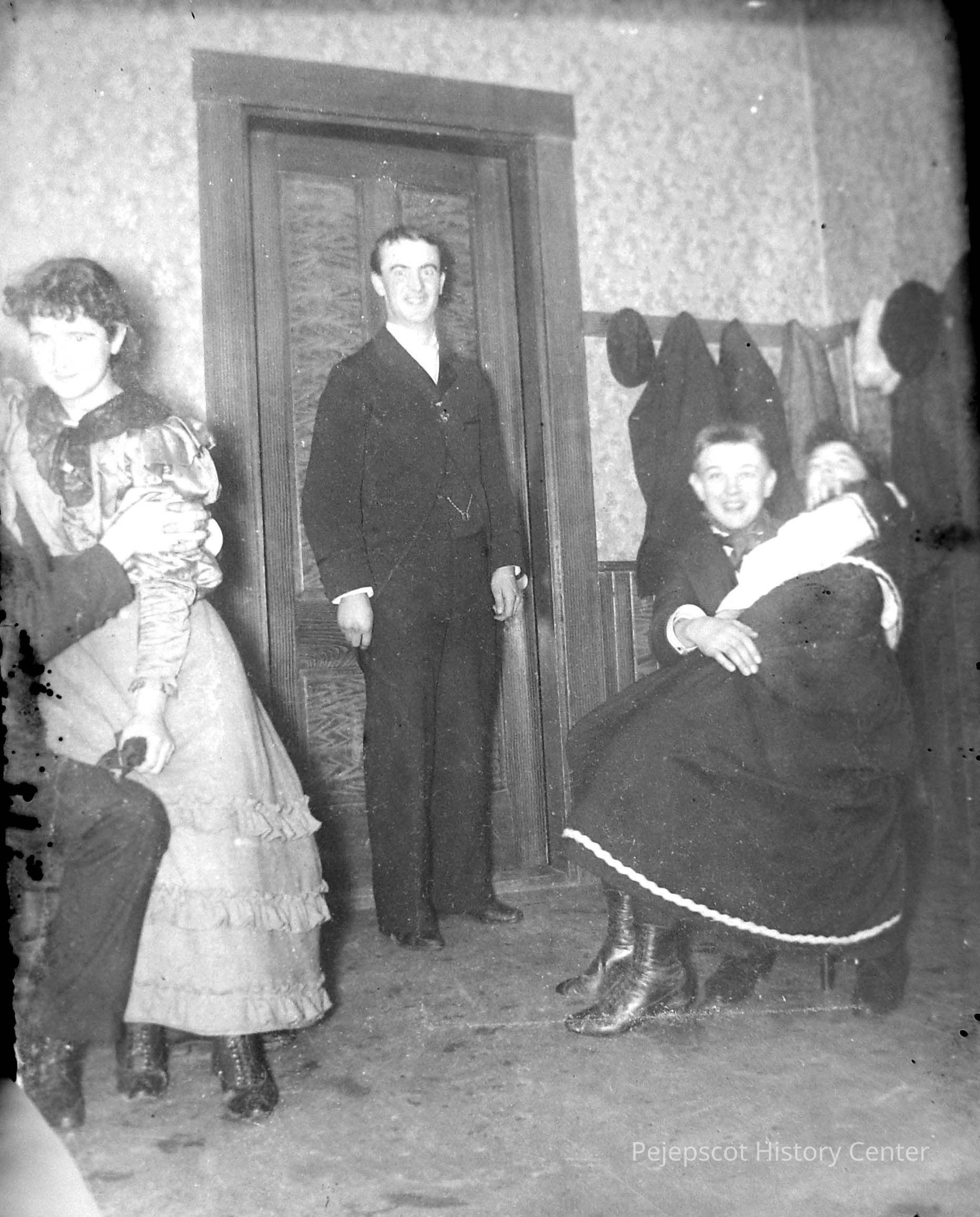 A glass plate negative with a photograph of a group of unknown people featuring a man in a door way in the center. Children are on both sides of him.